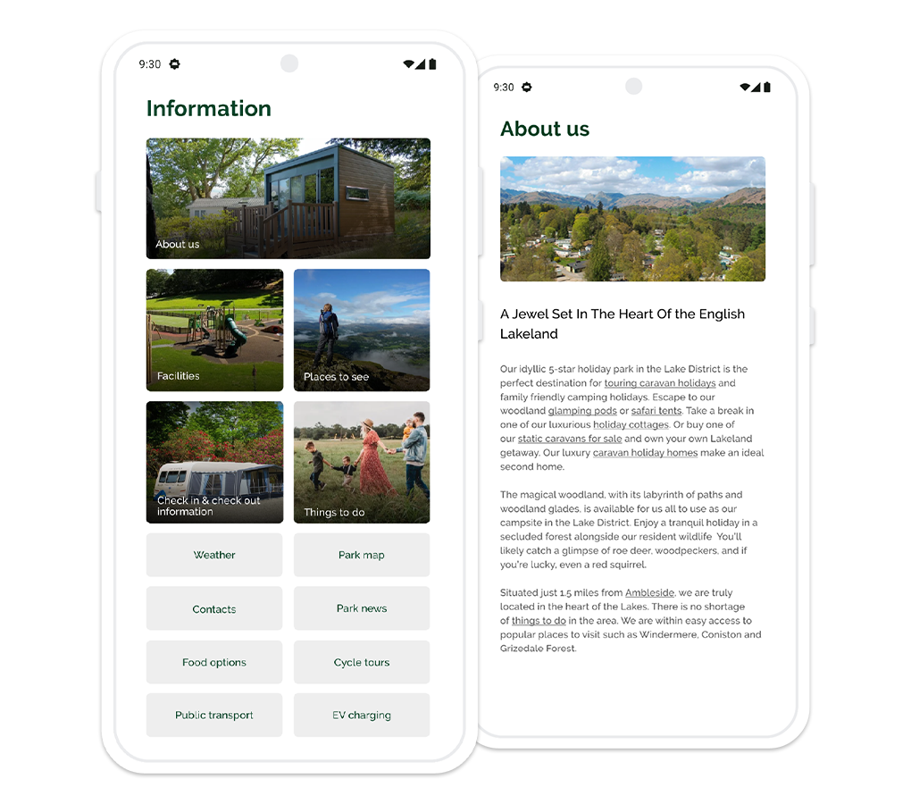 No more "What time is check-in?", "Where's the Wi-Fi code?", or "What's on this weekend?". Guests can explore your park digitally with maps, menus, facilities, local attractions, event listings and more - all customisable and managed from within CampManager.